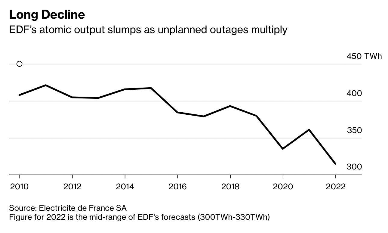 And for a while, France's fleet lived up to the hype. In 2005, the EDF produced 430 terawatt-hours. But today? They're praying to crack 300. This graph from Bloomberg is instructive.