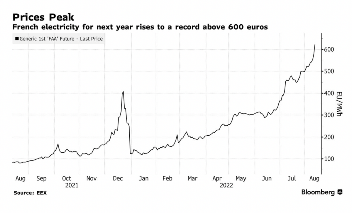 "Benchmark German power for next year rose as much as 6.6% to a record 455 euros a megawatt-hour on the European Energy Exchange AG," reports Bloomberg. "The French contract was up as much as 7.8%, rising to 622 euros a megawatt-hour. That’s about $1,100 for the equivalent energy of a barrel of oil."
