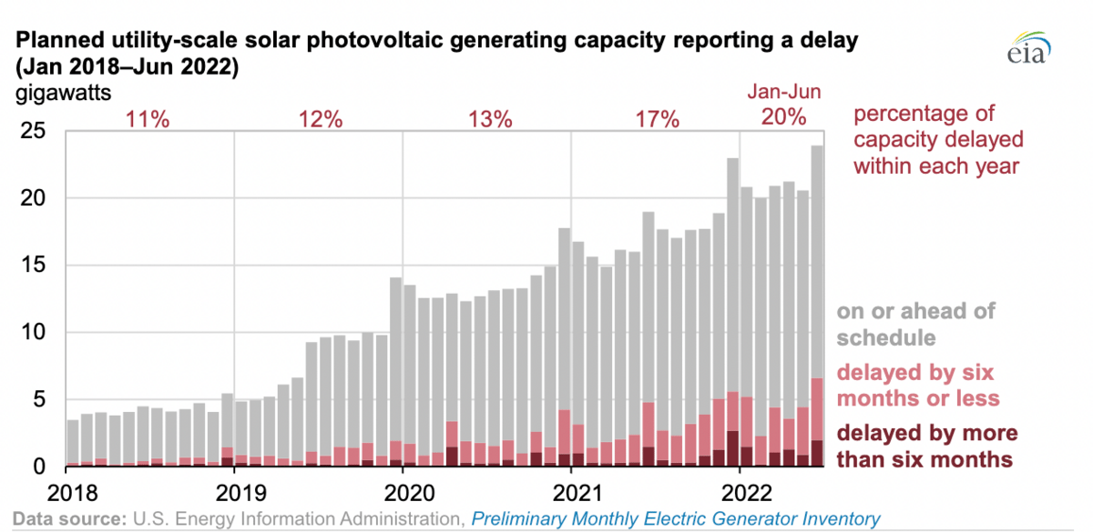 Utility-scale solar projects are seeing delays per the EIA's latest analysis.