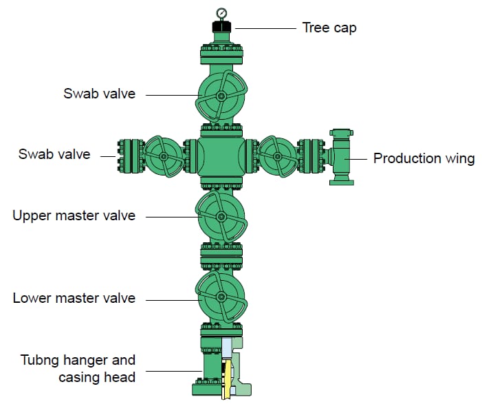 The set of valves, spools, and fittings connected to the top of a well to direct and control the flow of formation fluids from the well.