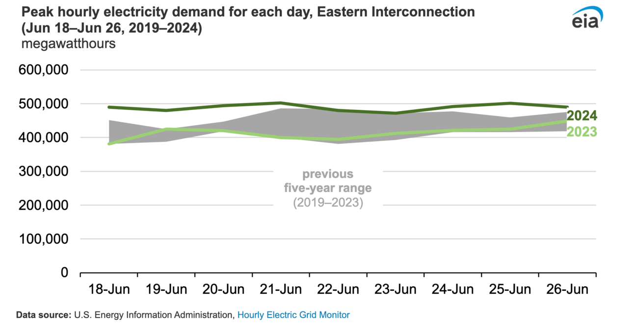 As data from the Energy Information Administration (EIA) points out, “the Eastern Interconnection—which covers much of the mainland United States east of the Rocky Mountains except Texas—peaked at 502,670 megawatts (MW) in a single hour on June 21, compared with the hourly June peak of 467,609 MW in 2023.”