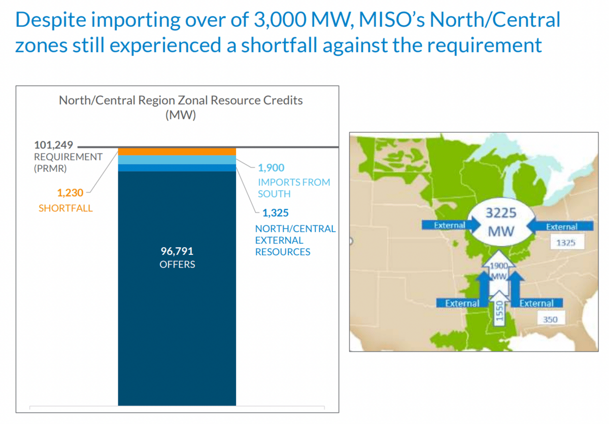 But that's not all. "Although installed capacity has increased in the last five years," reads a slide, "accredited capacity has decreased due to thermal retirements and the increasing transition to renewables." MISO has lost firm (or reliable) generators while adding more intermittent renewable capacity which cannot replace it. Thus, they're struggling to meet their capacity needs. Imports haven't been able to fill in the gap.