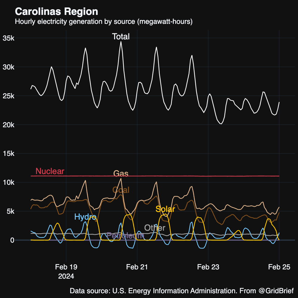 Nuclear, gas, and coal kept the Carolinas humming, though solar jumped above coal several times.