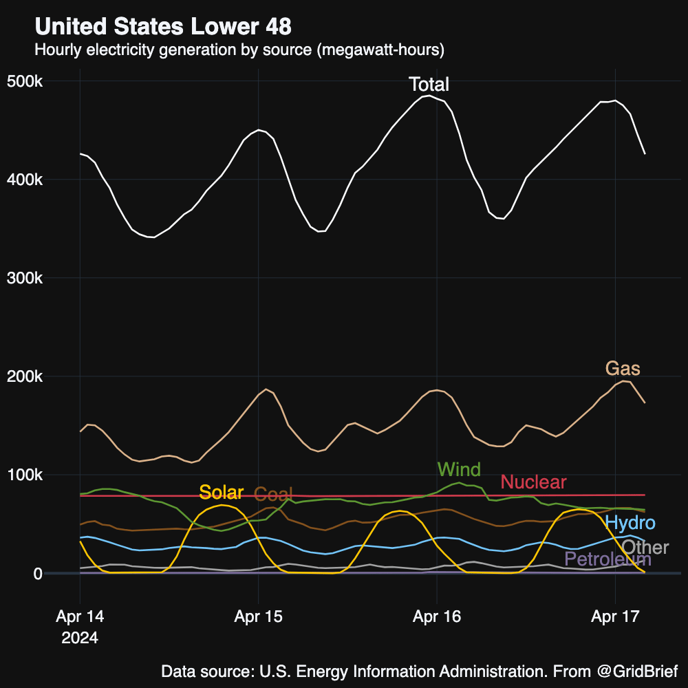 Nuclear and natural gas were the standouts in America’s largest public power entity. Hydro’s drops into the negatives were likely battery charging.