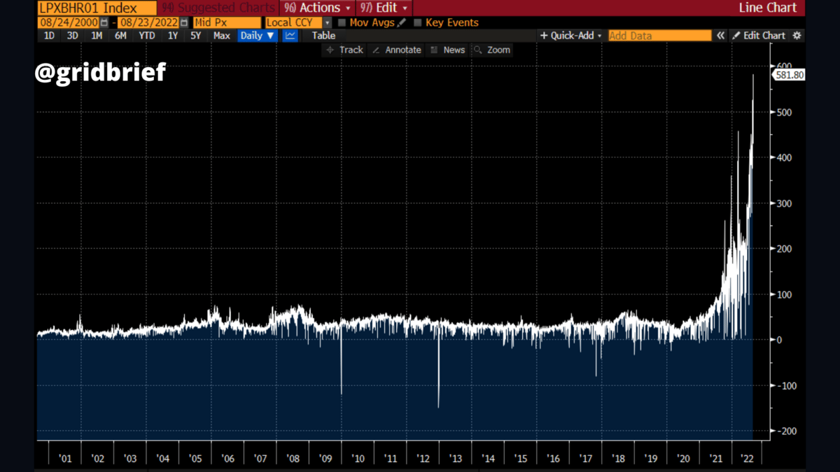 German daily day-ahead electricity prices look particularly scary right now. To put this price spike in perspective, they never closed above €100 in 2021. Now they're approaching €600.