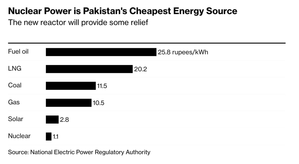 But this nuclear reactor won't do much to ease Pakistan's pain in the near term. Since the energy crisis, Pakistan's grid has been a shambles. Once the country got priced out of the LNG market by the Europeans, its heavily gas dependent grid started to experience shortages. Pakistan is currently in discussions with the IMG to raise its energy tariffs in exchange for bailout money.
