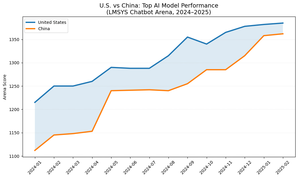 U.S. vs. China: Top AI Model Performance (LMSYS Chatbot Arena, 2024–2025)