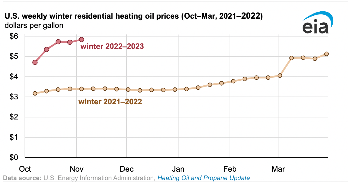 Heating oil prices in October of this year are already 65% higher than they were last year. October is the first month of what the Energy Information Administration calls the "winter heating period." It lasts until March.