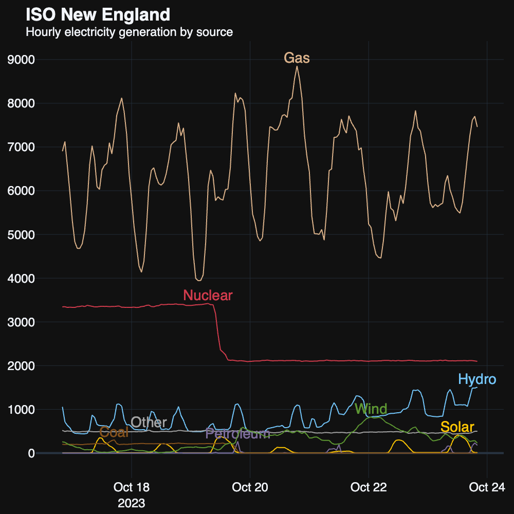 Natural gas, nuclear, and coal—with brief surges from wind.