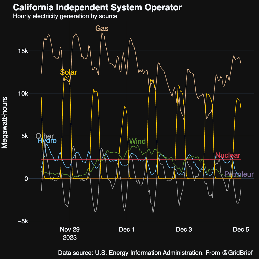 Natural gas and solar had a typically productive week in California. Solar went negative likely via exports and battery charging. Hydro, wind, and nuclear all vied for third.