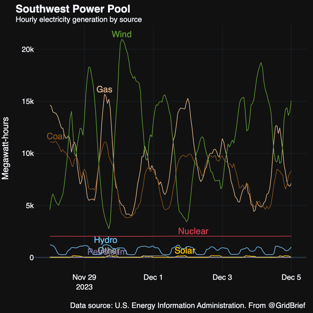 A volatile week in the Southwest. Natural gas, wind, and coal frequently swapped places in the top three with each other.