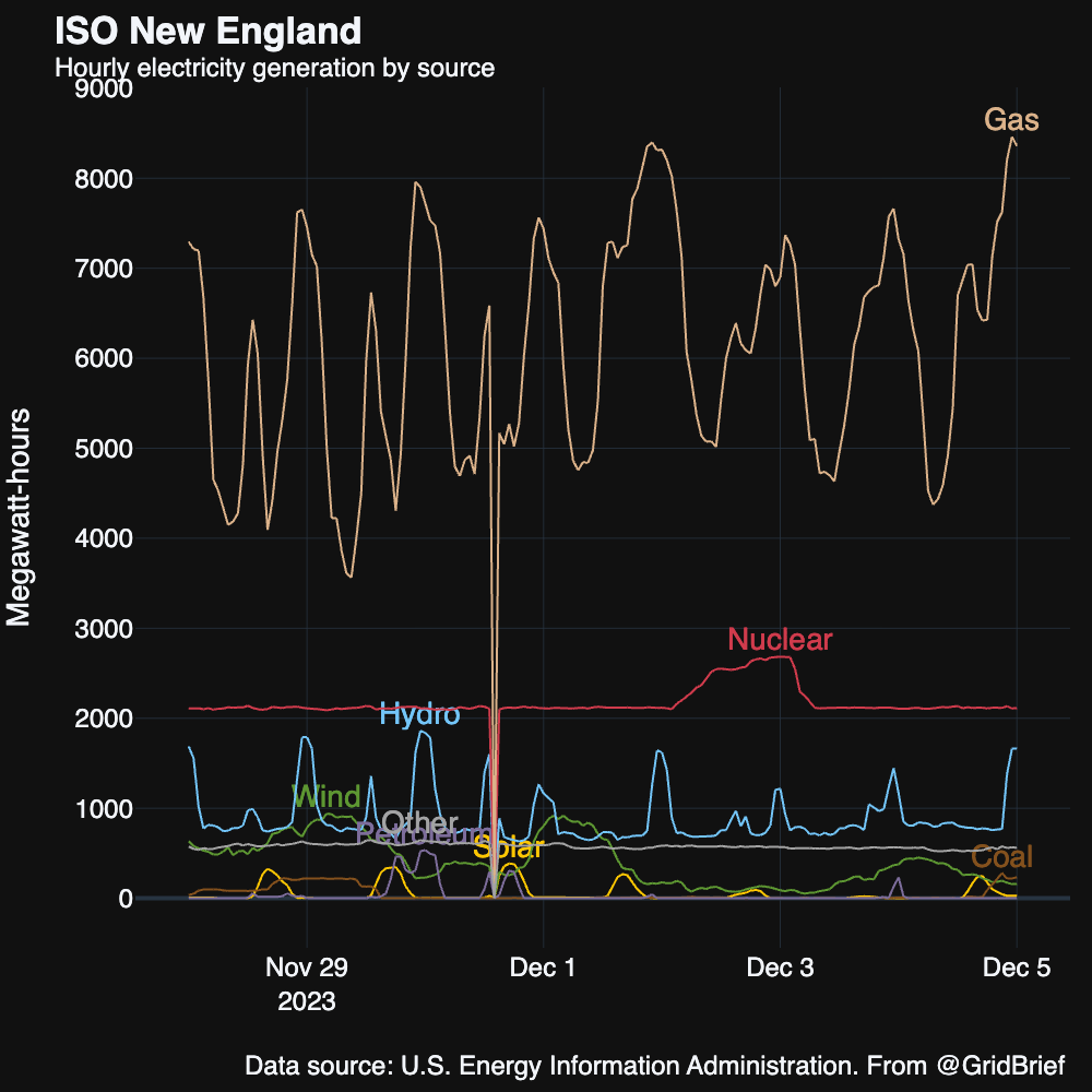 New England saw a typical week: natural gas, nuclear, and hydro. It looks like there was a data glitch on Nov. 30.