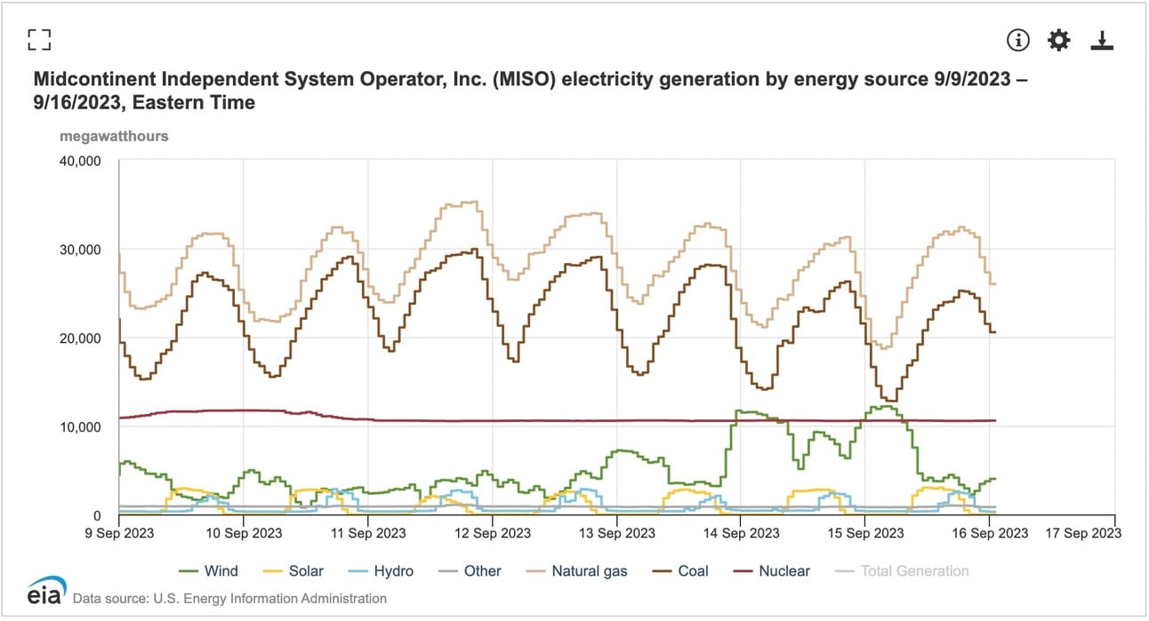 Natural gas, coal, and nuclear were the major generation sources in the Midcontinent Independent System Operator. When wind really showed up on the 14th and 15th, it brought down gas and (especially) coal generation. MISO recently announced it has nearly 50 gigawatts of interconnection-approved-but-stalled projects, which you can read about here.
