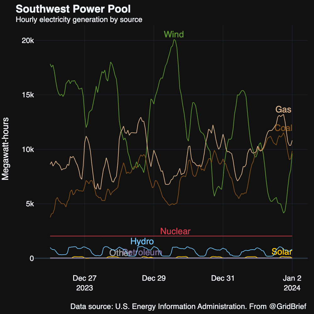 Wind, natural gas, and coal were the stars of the Southwest Power Pool. Wind had a remarkably good week, in fact.