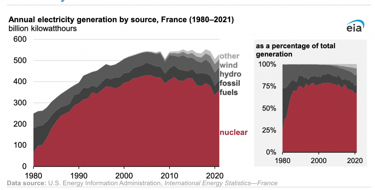 Nuclear generated 68% of France's electricity in 2021. "France has one of the largest nuclear power programs in the world. Nuclear power plants in France generated 361 billion kilowatthours of electricity in 2021, accounting for 68% of the country’s annual electricity generation, the highest nuclear generation share in the world," reports the Energy Information Administration. "France has 56 operable nuclear reactors with a total capacity of 61 gigawatts (GW), second only to the95 GW nuclear fleet in the United States. Nuclear plants accounted for 19% of U.S. electricity generation in 2021. Although France’s first commercial nuclear reactor came online in the 1960s, the country began the large-scale plan to build its nuclear power fleet in the mid-1970s, following the1973 oil crisis. At the time of the oil crisis, oil-burning power plants generated a significant share of France’s electricity."